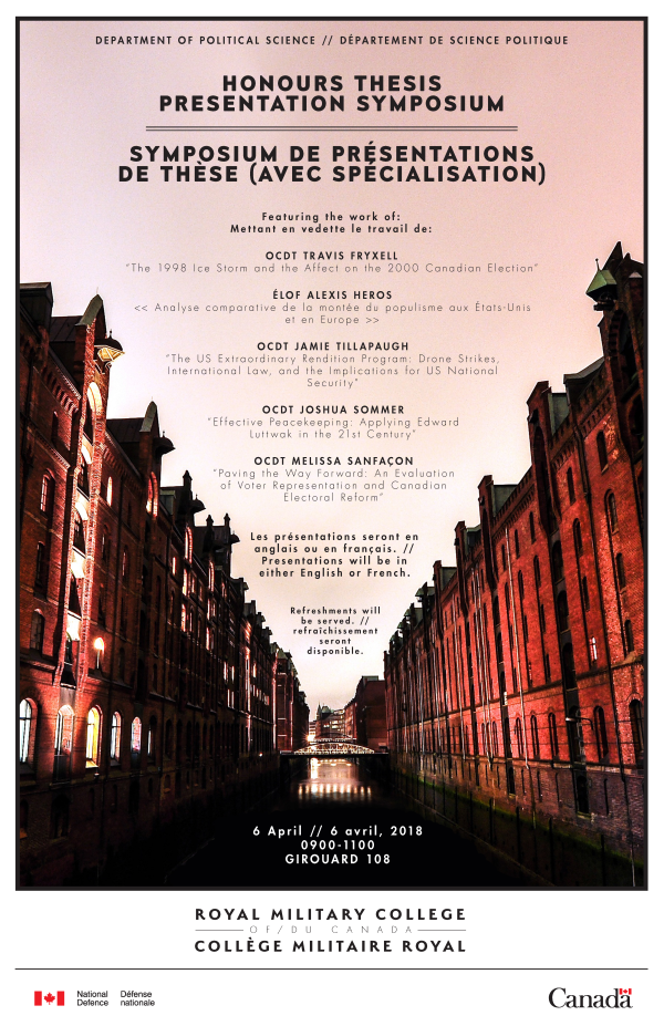Jan 30th: The Department of Political Science and The Centre for Security, Armed Forces and Society (CSAFS) invite faculty and graduate students to: Publishing your Manuscript with a University Press presented by Ms. Emily Andrew, Senior Acquisitions Editor for UBC Press. Thursday 30 January 2014. Part of the series on scholarly publishing and research. Note: English presentation; an event similar in nature will follow at a later date in French. Scholars wishing to meet individually with Ms. Andrew the morning of 30 Jan 14 to discuss a book proposal should contact the undersigned. The event is for information purposes only and not intended to endorse any press in particular. OPI : Dr. Christian Leuprecht, ext 6428, christian.leuprecht@rmc-cmr.ca.